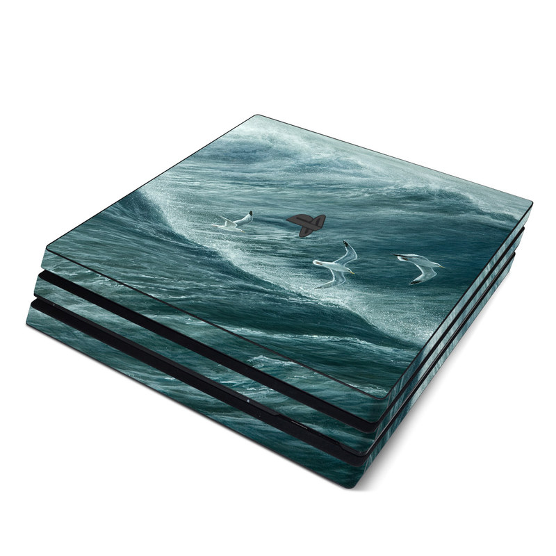 iStyles PlayStation 4 Pro Skin design of Wave, Wind wave, Tide, Sea, Ocean, Water, Sky, Wind, Tsunami, Surfing, with blue, white colors, and tagged with animals, nature, bay, beach, ocean, sea, seagulls, swell, wave.