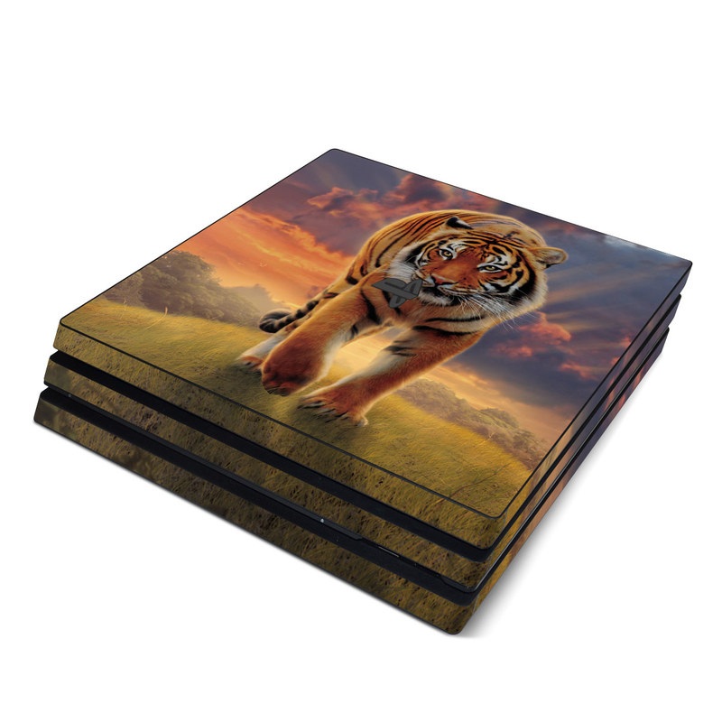 iStyles PlayStation 4 Pro Skin design of Tiger, Wildlife, Bengal tiger, Mammal, Felidae, Siberian tiger, Sky, Big cats, Terrestrial animal, Carnivore, with black, white, yellow, red, green, blue colors, and tagged with animals, nature, animal, nature, sunrise, sunset, tiger, wildlife.