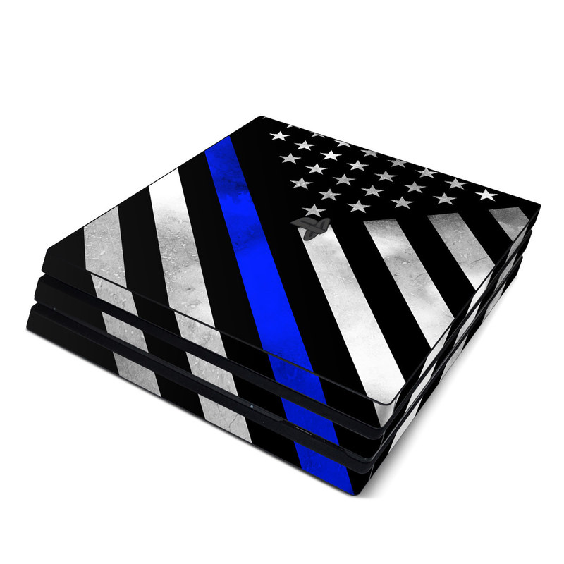 iStyles PlayStation 4 Pro Skin design of Flag of the united states, Flag, Cobalt blue, Pattern, Line, Black-and-white, Design, Monochrome, Electric blue, Parallel, with black, white, gray, blue colors, and tagged with flags, signs, firstresponder, flag, police, rescue, thinline.