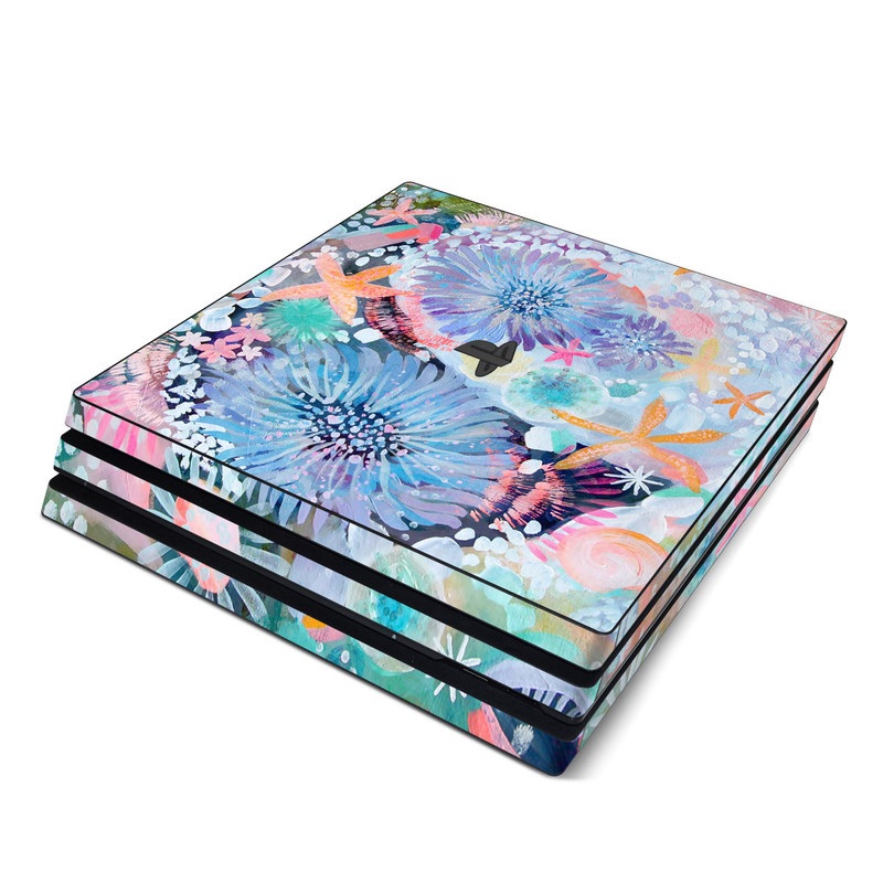 iStyles PlayStation 4 Pro Skin design of Pattern, Aqua, Textile, Design, Watercolor paint, Visual arts, Flower, Art, Plant, Illustration, with blue, orange, pink, purple, green, white colors, and tagged with nature, flowers, animals, beach, bright, flowers, ocean, pastel, sea, sealife, starfish, water, watercolor.