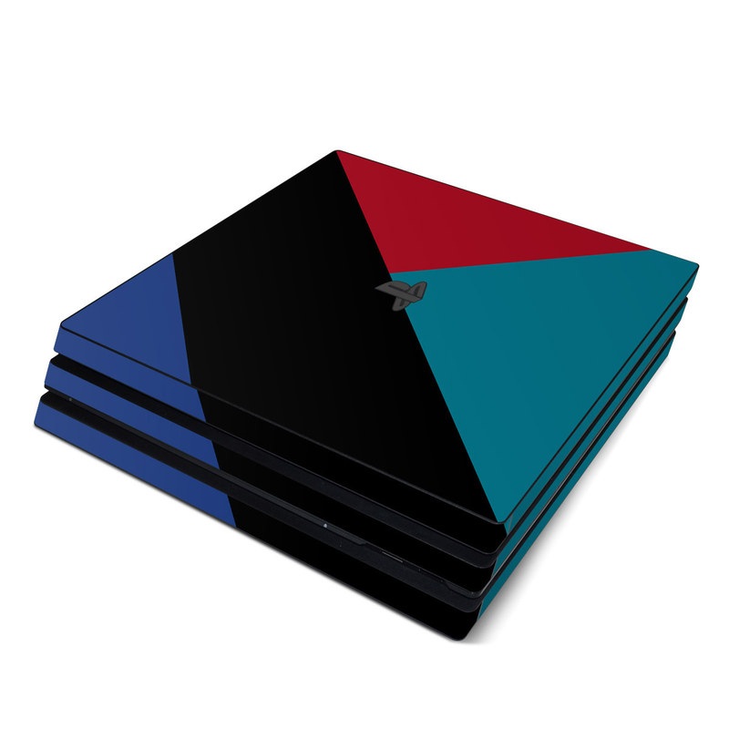 iStyles PlayStation 4 Pro Skin design of Blue, Green, Turquoise, Azure, Teal, Electric blue, Line, Pattern, Design, Graphic design, with black, blue, red colors, and tagged with patterns, block, blocking, color, colorblock, geometric, shape, simple.