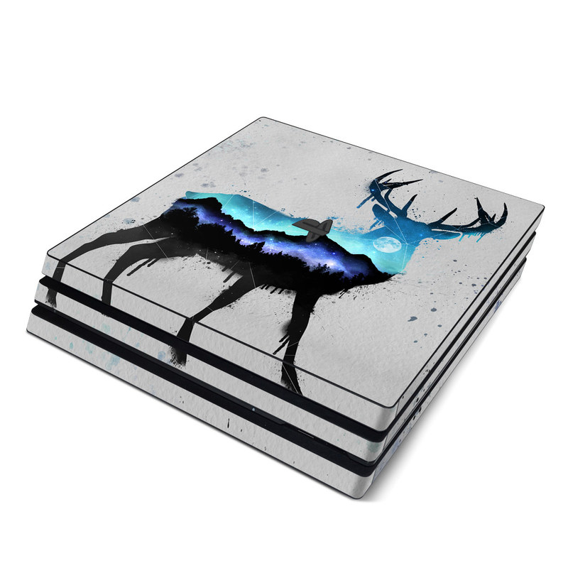 iStyles PlayStation 4 Pro Skin design of Reindeer, Deer, Illustration, Watercolor paint, Art, Elk, Wildlife, Drawing, Paint, Graphics, with gray, black, blue, purple, white colors, and tagged with animals, nature, space, animals, deer, moon, nature, night, stars, watercolor.