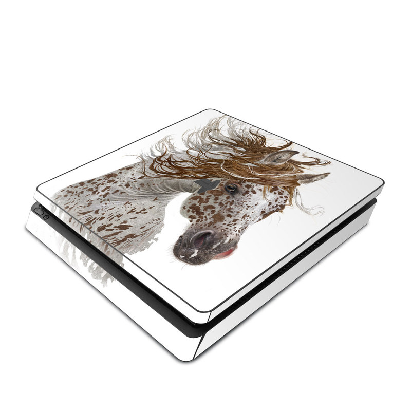 iStyles PlayStation 4 Slim Skin design of Horse, Mane, Mustang horse, Illustration, Snout, Animal figure, Drawing, Stallion, Liver, Mare, with white, brown colors, and tagged with animals, animals, horse, horses, pony.