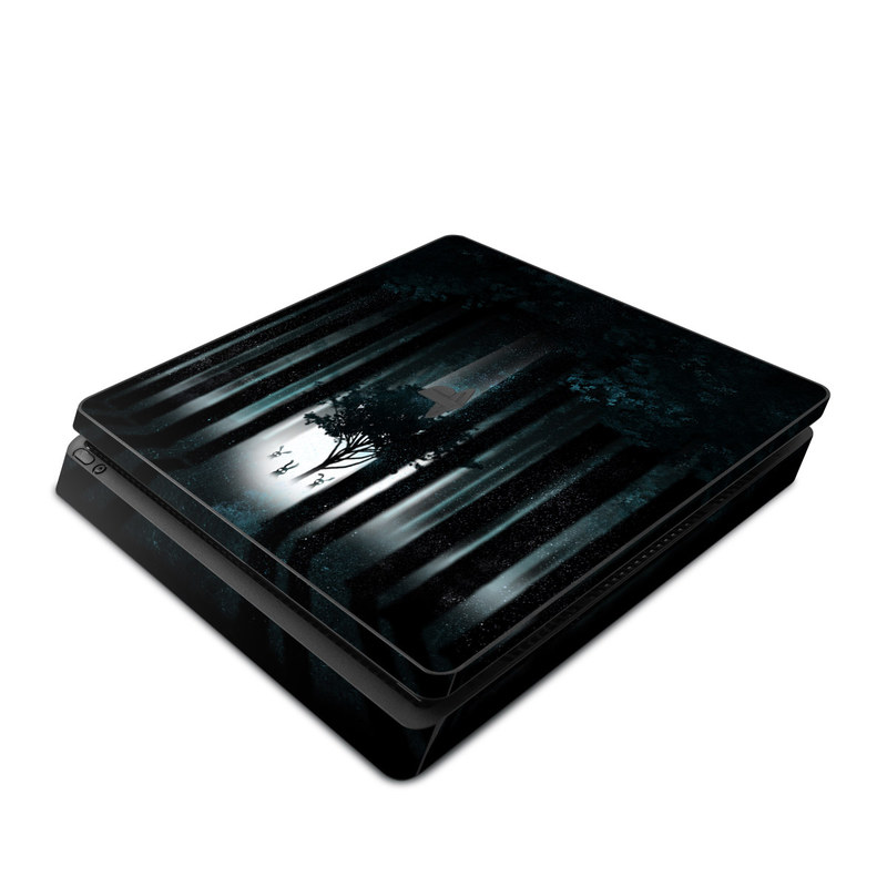 iStyles PlayStation 4 Slim Skin design of Darkness, Black, Nature, Tree, Natural environment, Forest, Atmosphere, Atmospheric phenomenon, Light, Natural landscape, with black, blue, white colors, and tagged with animals, nature, fantasy, space, aliens, creatures, fae, fairy, forest, ghosts, lights, monsters, rabbit, scary, trees, ufo.