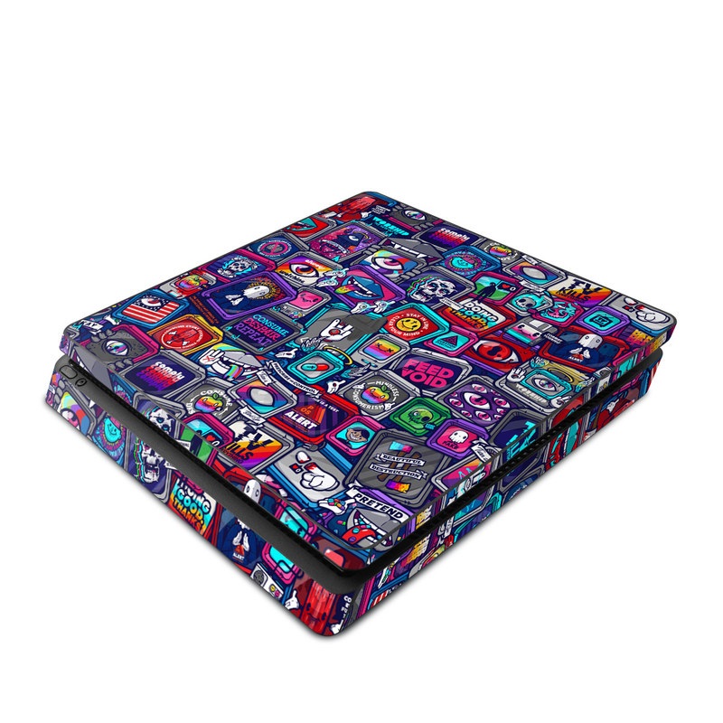 iStyles PlayStation 4 Slim Skin design of Pattern, Font, Art, Visual arts, Collection, with red, blue, black, gray, purple, yellow, white, green colors, and tagged with patterns, objects, signs, skulls, illustration, modern, skull, tattoo, thenewgods, tv, vector.
