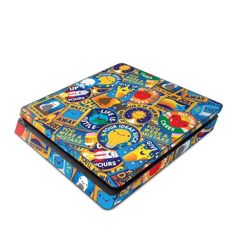 iStyles PlayStation 4 Slim Skin design of Pattern, Visual arts, Design, Art, Mosaic, Psychedelic art, with blue, yellow, orange, white, green, red, gray colors, and tagged with patterns, signs, space, objects, hearts, fuck, funny, humor.