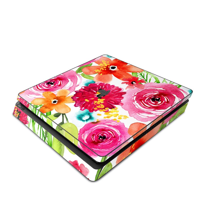 iStyles PlayStation 4 Slim Skin design of Flower, Cut flowers, Floral design, Plant, Pink, Bouquet, Petal, Flower Arranging, Artificial flower, Clip art, with pink, red, green, orange, yellow, blue, white colors, and tagged with flowers, patterns, bloom, blooms, florals, flowers, pink, watercolor.