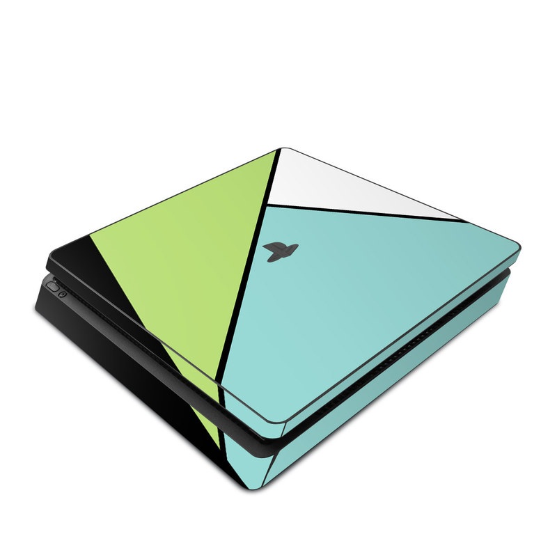 iStyles PlayStation 4 Slim Skin design of Green, Line, Blue, Triangle, Design, Parallel, Pattern, Graphic design, Slope, with white, black, green, blue colors, and tagged with patterns, block, blocking, color, colorblock, geometric, shape, simple.