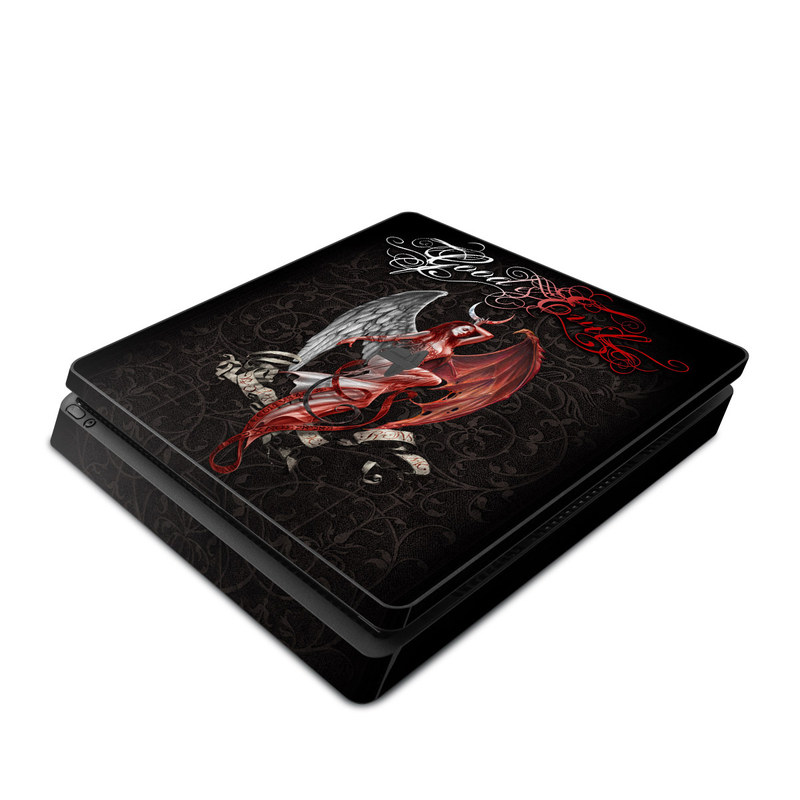 iStyles PlayStation 4 Slim Skin design of Illustration, Fictional character, Graphic design, Supernatural creature, Demon, Cg artwork, Art, Mythology, Angel, Wing, with black, white, red colors, and tagged with signs, people, fantasy, animals.