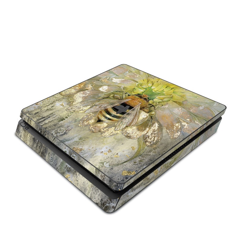 iStyles PlayStation 4 Slim Skin design of Honeybee, Insect, Bee, Membrane-winged insect, Invertebrate, Pest, Watercolor paint, Pollinator, Illustration, Organism, with yellow, orange, black, green, gray, pink colors, and tagged with animals, flowers, animal, bee, bugs, bumblebee, flower, honeybee.