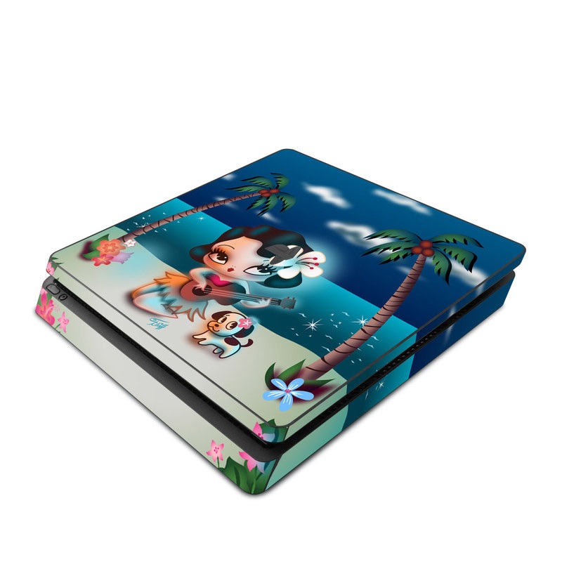 iStyles PlayStation 4 Slim Skin design of Cartoon, Animated cartoon, Illustration, Animation, Fictional character, Plant, Art, Clip art, with blue, white, brown, pink, green, yellow, red colors, and tagged with animals, objects, flowers, nature, people, beach, cartoon, flower, flowers, hawaii, hawaiian, hula, ocean, pinup, pinupgirl, tropic, tropical.