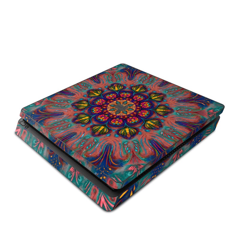 iStyles PlayStation 4 Slim Skin design of Psychedelic art, Pattern, Art, Textile, Symmetry, Visual arts, Design, Fractal art, Kaleidoscope, Tapestry, with blue, yellow, red, green, pink, green colors, and tagged with patterns, flowers, abstract, abstract, blue, bright, floral, flower, green, pink, teal, yellow.