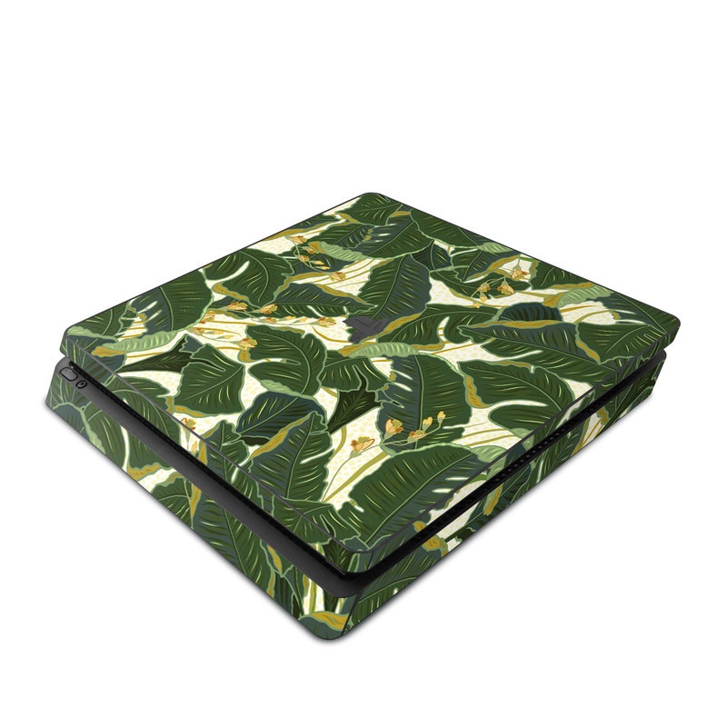 iStyles PlayStation 4 Slim Skin design of Leaf, Plant, Flower, Pattern, Botany, Tree, Design, Flowering plant, Arrowroot family, Terrestrial plant, with green, yellow colors, and tagged with patterns, flowers, nature, filigree, floral, leaves, palmleaves, palms, pattern.