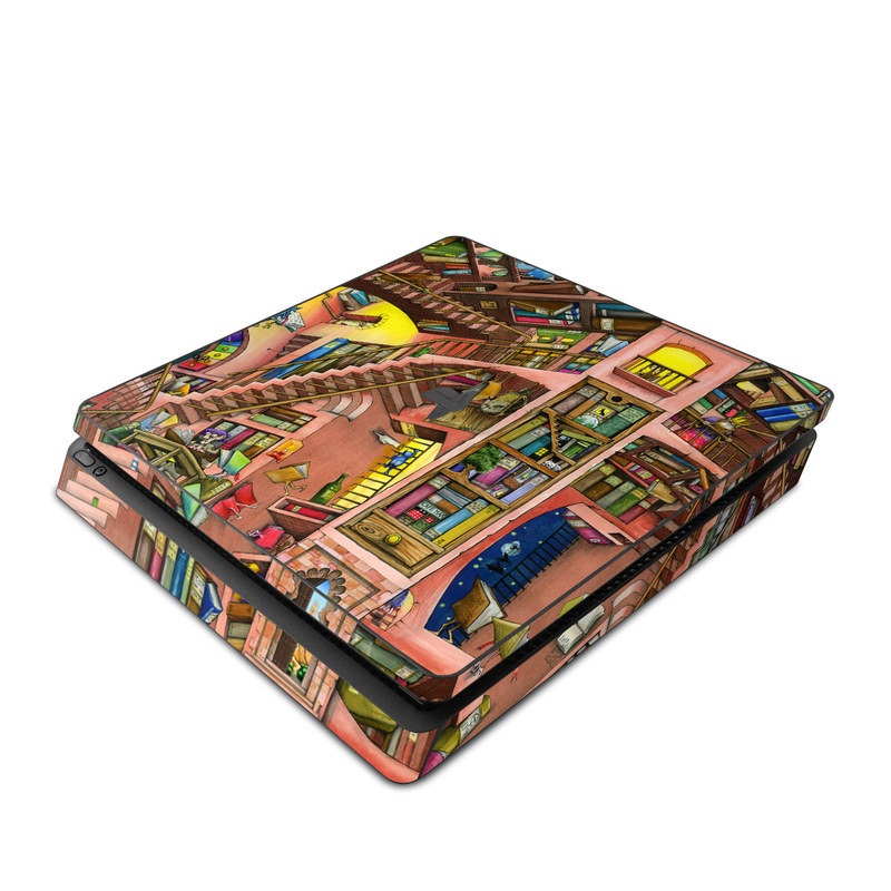 iStyles PlayStation 4 Slim Skin design of Cartoon, Building, Art, Architecture, Design, Fun, Retail, Illustration, Neighbourhood, Room, with pink, yellow, blue, red, orange, brown colors, and tagged with patterns, urban, objects, animals, book, books, fantasy, illustration, library, reading.