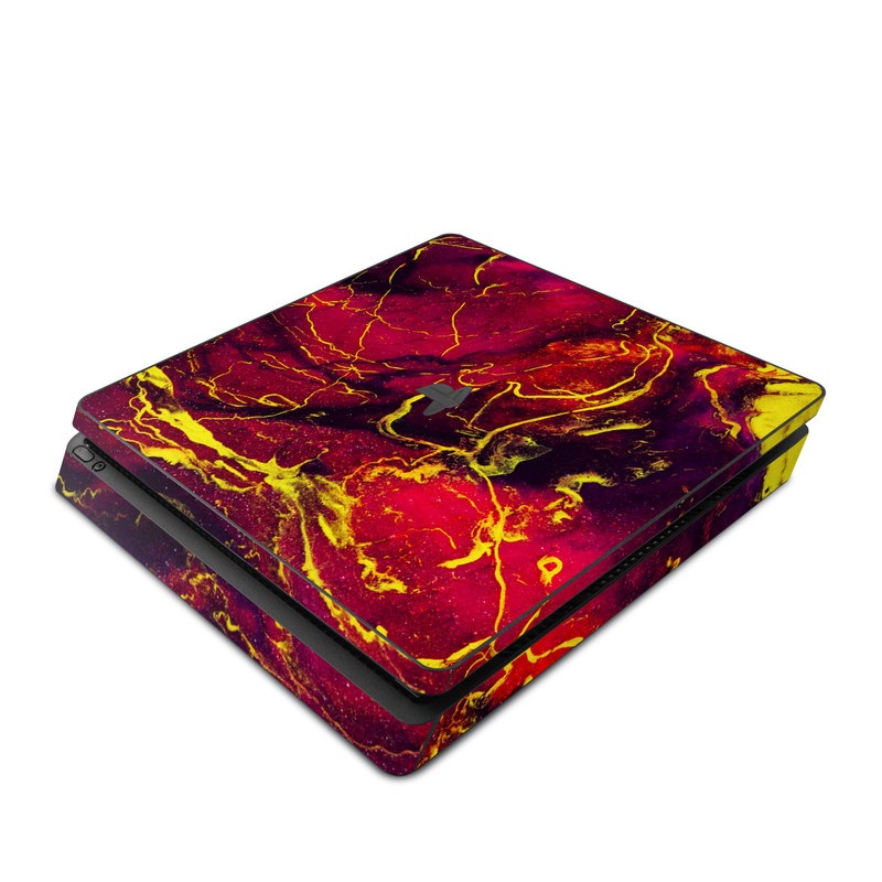iStyles PlayStation 4 Slim Skin design of Red, Purple, Geological phenomenon, Pattern, Fractal art, Art, Fictional character, Graphics, with red, yellow, black colors, and tagged with abstract, space, galactic, marble, paint, painting, purple, red, space, splatter, yellow.