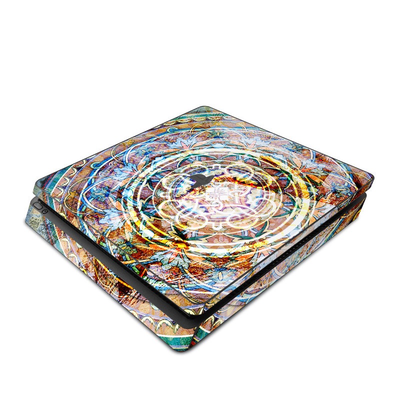 iStyles PlayStation 4 Slim Skin design of Circle, Ceramic, Tableware, with yellow, red, orange, white, blue, green, gray colors, and tagged with patterns, objects, aztec, medallion, tribal.