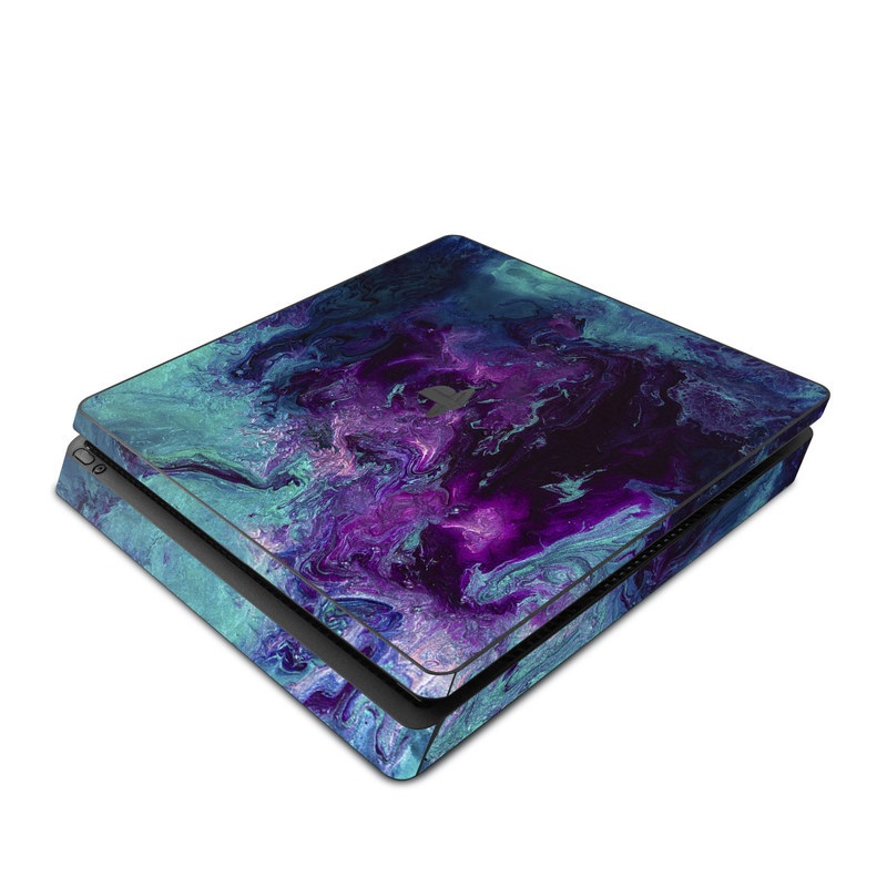 iStyles PlayStation 4 Slim Skin design of Blue, Purple, Violet, Water, Turquoise, Aqua, Pink, Magenta, Teal, Electric blue, with blue, purple, black colors, and tagged with abstract, space, galaxy, marbles, milkyway, nebula, space.