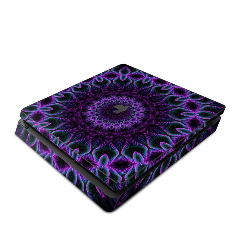 iStyles PlayStation 4 Slim Skin design of Colorfulness, Pattern, Purple, Violet, Magenta, Red, Pink, Art, Fractal Art, Visual Arts, Design, Circle, Symmetry, Psychedelic Art, Motif, Kaleidoscope, Graphics, with black, purple, blue, white colors, and tagged with patterns, fractals, balance, flowers, green, leaves, mandala, nature, neon, pink, purple, rainbow, symmetry.