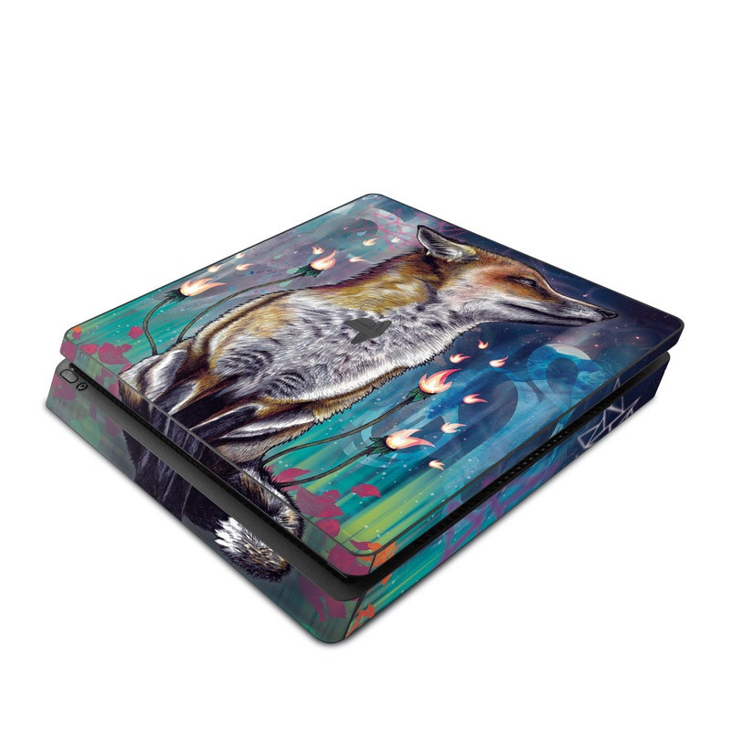 iStyles PlayStation 4 Slim Skin design of Red fox, Art, Wildlife, Canidae, Illustration, Fox, Carnivore, Painting, Dhole, Red wolf, with black, gray, blue, red, green colors, and tagged with animals, patterns.