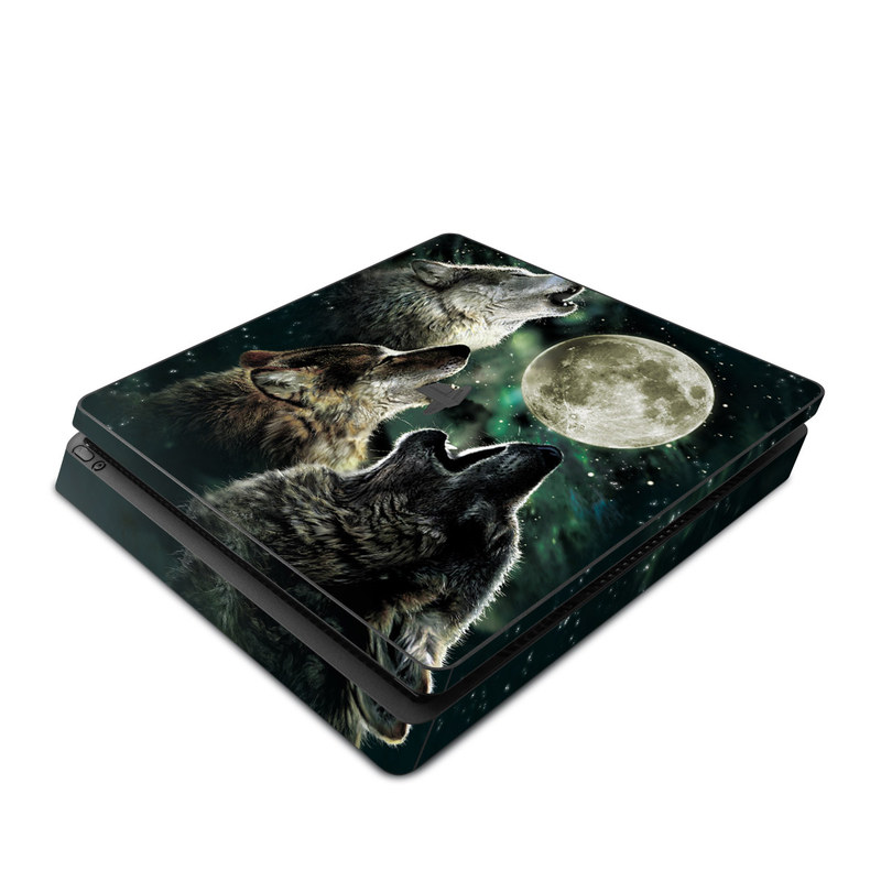iStyles PlayStation 4 Slim Skin design of Wolf, Light, Astronomical object, Moon, Wildlife, Organism, Moonlight, Sky, Atmosphere, Celestial event, with black, gray, green colors, and tagged with animals.