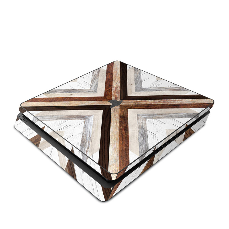 iStyles PlayStation 4 Slim Skin design of Architecture, Line, Pattern, Brown, Symmetry, Wood, Design, Building, Facade, Material property, with white, brown, gray colors, and tagged with lookslike, patterns, nature, finish, geometric, natural, nature, stained, wood, wooden.