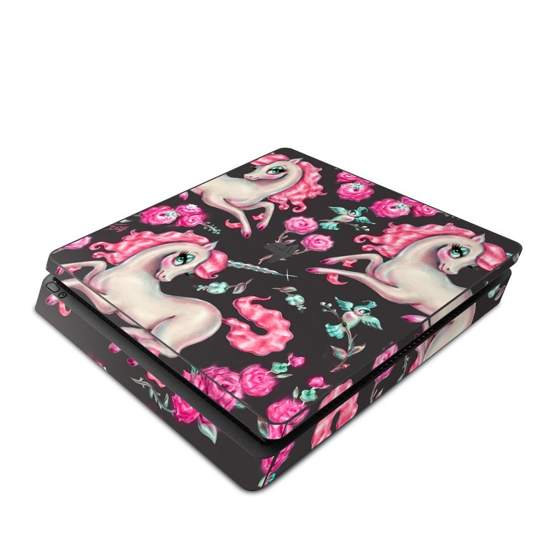 iStyles PlayStation 4 Slim Skin design of Pink, Horse, Pony, Fictional character, Unicorn, Mythical creature, Mane, Textile, Animal figure, Illustration, with white, pink, blue, black, red colors, and tagged with patterns, animals, flowers, fantasy, flower, flowers, magic, magical, pink, rose, roses, unicorn, unicorns.