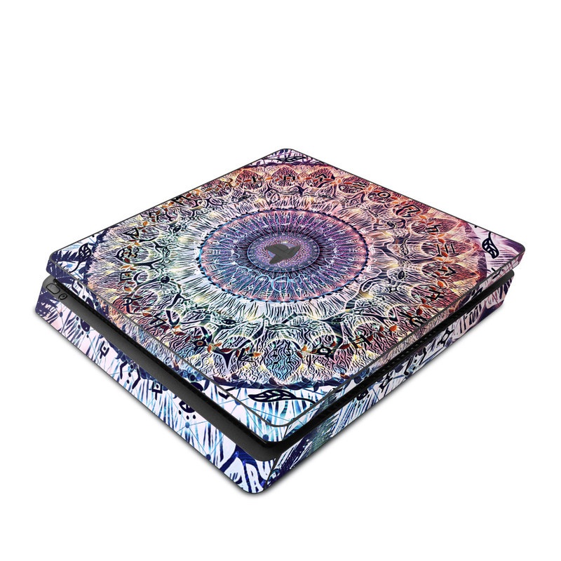 iStyles PlayStation 4 Slim Skin design of Tapestry, Pattern, Art, Close-up, Circle, Fractal art, Textile, Eye, Design, Kaleidoscope, with blue, red, yellow, purple, green colors, and tagged with patterns.