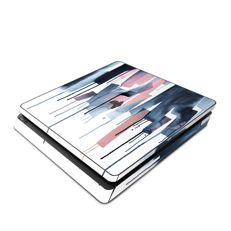 iStyles PlayStation 4 Slim Skin design of Gesture, Snow, Art, Freezing, Material property, Font, Fashion design, Sportswear, Electric blue, Magenta, with white, blue, pink, black colors, and tagged with patterns, abstract, nature, abstract, blue, dye, navy, paint, painting, pattern, pink, stripes, tiedye.