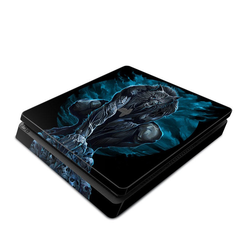 iStyles PlayStation 4 Slim Skin design of Illustration, Fictional character, Werewolf, Darkness, Art, Mythology, Graphic design, Mythical creature, Cg artwork, with gray, blue, black colors, and tagged with animals, skulls, fantasy.