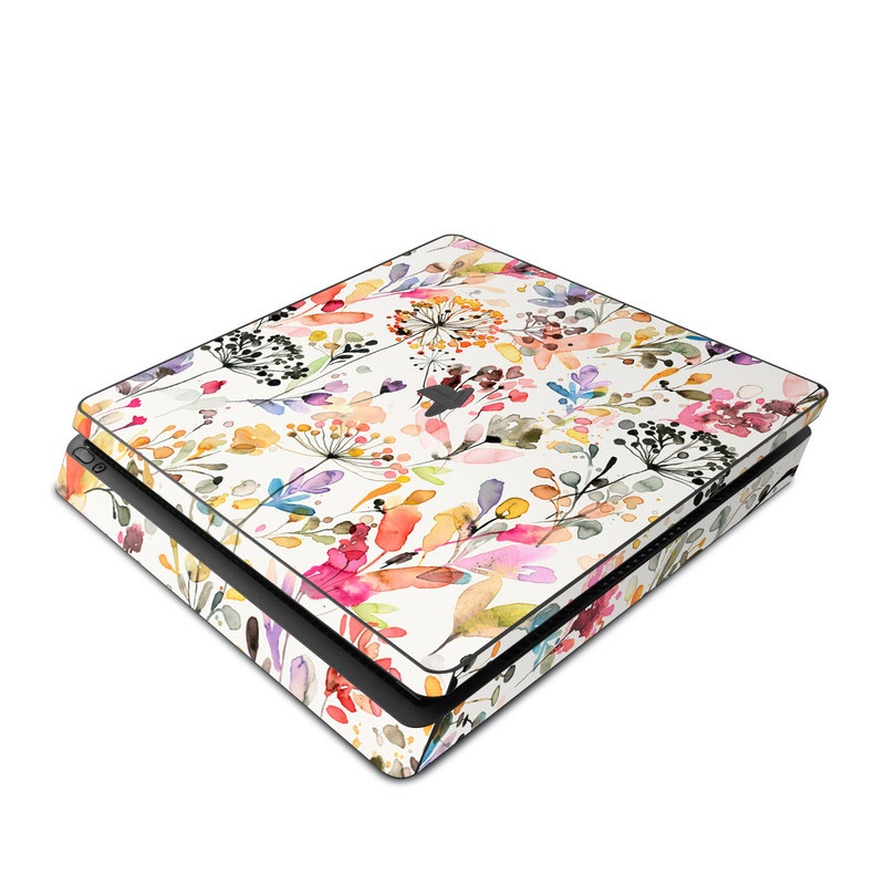 iStyles PlayStation 4 Slim Skin design of Flower, Petal, Rectangle, Branch, Creative arts, Plant, Line, Art, Painting, Font, with white, pink, red, yellow, orange, green, blue, purple colors, and tagged with patterns, flowers, nature, flower, flowers, garden, grass, nature, outdoors, watercolor.