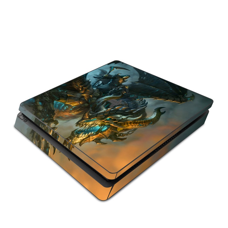 iStyles PlayStation 4 Slim Skin design of Dragon, Cg artwork, Fictional character, Mythical creature, Demon, Mythology, Illustration, Cryptid, Art, with orange, yellow, black, brown, blue, white colors, and tagged with fantasy, animals, skulls, people, objects, bones, death, dragon, fire, grimreaper, skeleton.