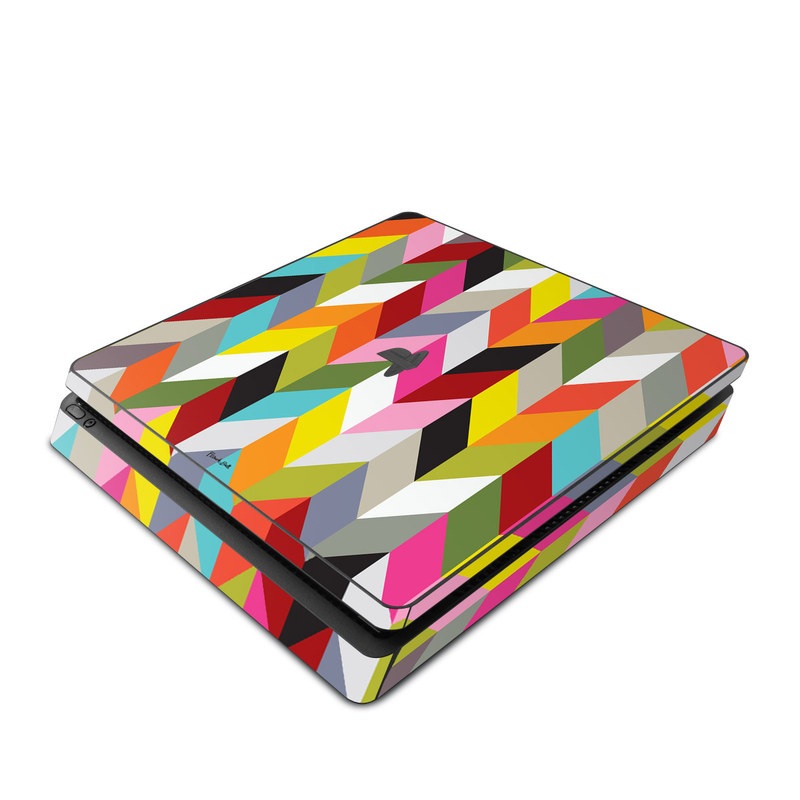 iStyles PlayStation 4 Slim Skin design of Pattern, Orange, Line, Design, Graphic design, Tints and shades, Triangle, with red, green, gray, black, blue, purple colors, and tagged with patterns.