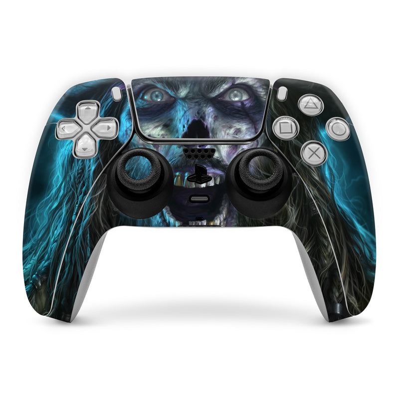 iStyles PlayStation 5 Controller Skin design of Darkness, Illustration, Art, Ghost, Fictional character, Beard, with black, white, blue, gray colors, and tagged with fantasy, skulls, people, fantasy, grimbeard, pirates.