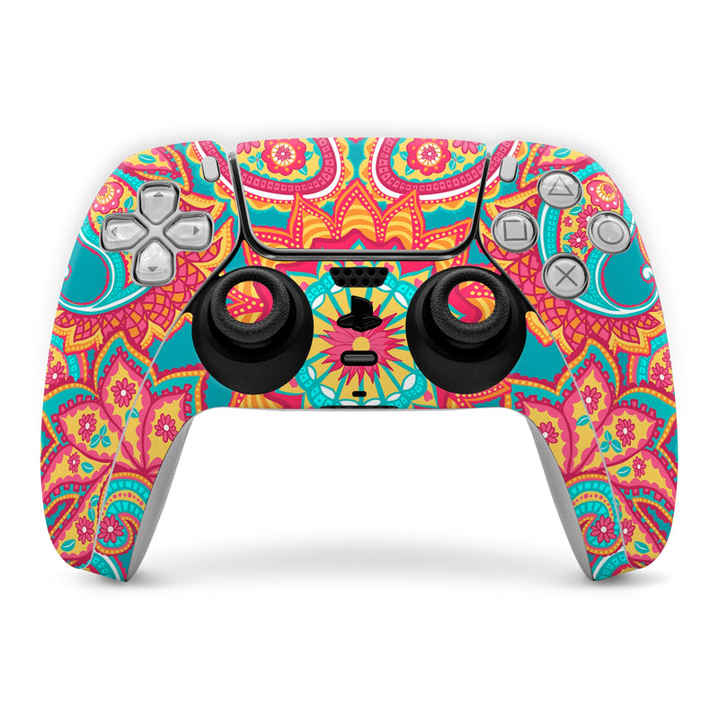 iStyles PlayStation 5 Controller Skin design of Pattern, Paisley, Motif, Visual arts, Design, Art, Textile, Psychedelic art, with orange, yellow, blue, red colors, and tagged with patterns, flowers.