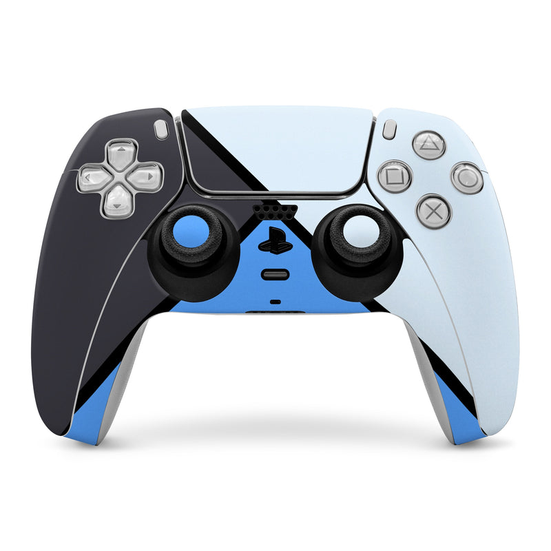 iStyles PlayStation 5 Controller Skin design of Blue, Line, Cobalt blue, Triangle, Azure, Electric blue, Parallel, Symmetry, Font, with blue, gray, black colors, and tagged with patterns, block, blocking, color, colorblock, geometric, shape, simple.