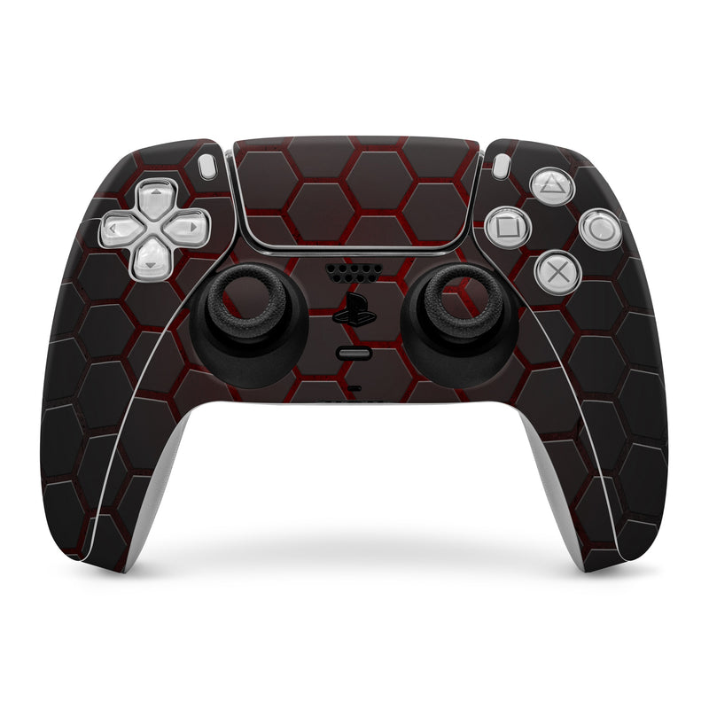 iStyles PlayStation 5 Controller Skin design of Black, Pattern, Metal, Design, Mesh, Carbon, Space, Wallpaper, with black, red colors, and tagged with lookslike, fantasy, space, drones, geometric, hexagon, tech.