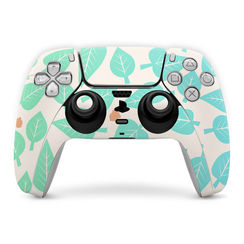 iStyles PlayStation 5 Controller Skin design of Aqua, Pattern, Turquoise, Teal, Wrapping paper, Design, Wallpaper, with yellow, green, orange colors, and tagged with patterns, nature, objects, animal, crossing, gaming, leaf, leaves, nature, trees.