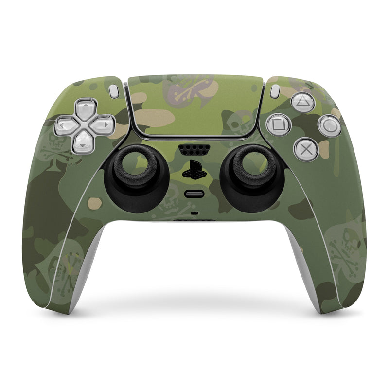iStyles PlayStation 5 Controller Skin design of Military camouflage, Pattern, Camouflage, Uniform, Clothing, Green, Design, Leaf, Plant, Illustration, with green, brown colors, and tagged with military, skulls, patterns, athlete, fitness, gym, skull, skulls, spade.