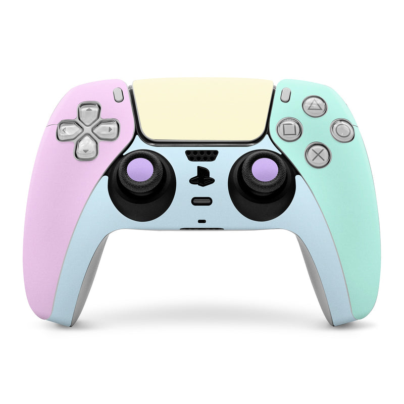 iStyles PlayStation 5 Controller Skin design, with pink, yellow, blue colors, and tagged with solidcolors, ice, cream, pastel.