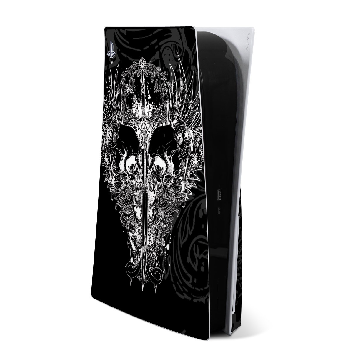 iStyles PlayStation 5 Skin design of Illustration, Art, Design, Monochrome, Graphic design, Pattern, Fictional character, Skull, Black-and-white, Graphics, with black, gray colors, and tagged with fantasy, patterns, objects.