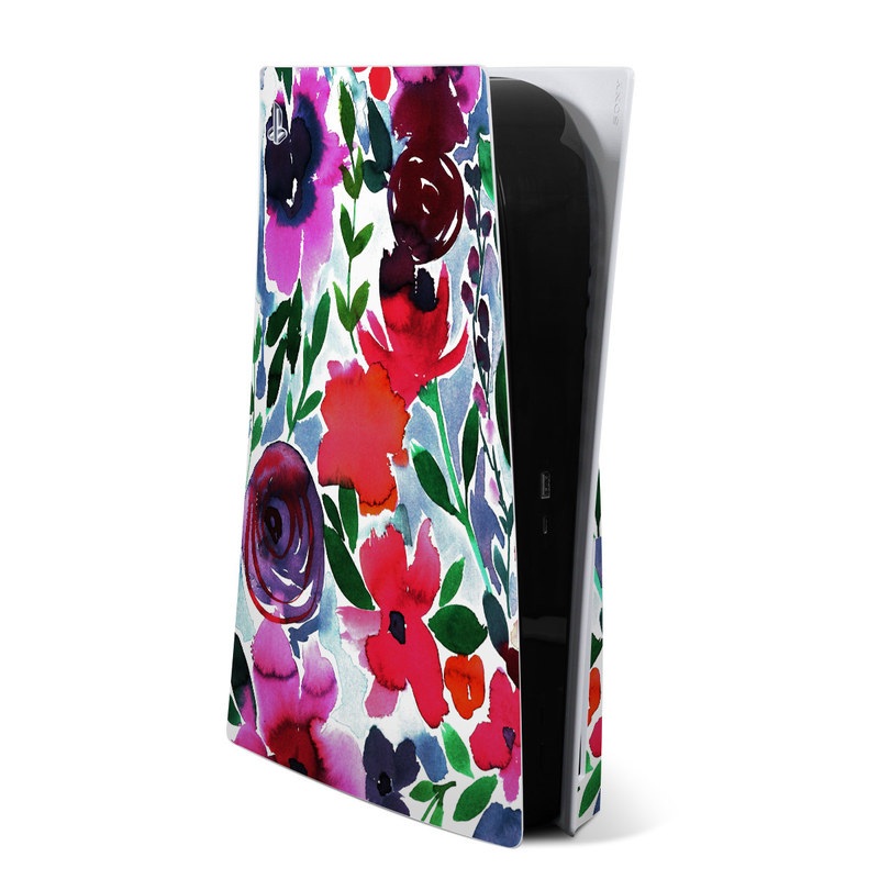 iStyles PlayStation 5 Skin design of Flower, Petal, Red, Plant, Pattern, Pink, Purple, Flowering plant, Botany, Design, with red, green, pink, blue colors, and tagged with patterns, flowers, flowers, watercolor, watercolorflowers.