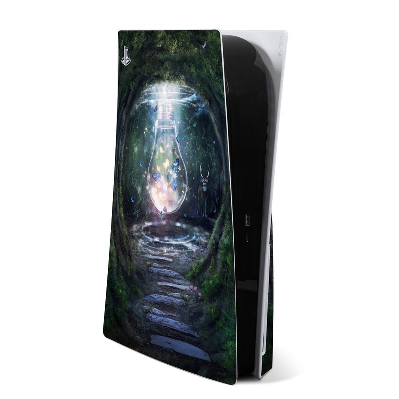 iStyles PlayStation 5 Skin design of Nature, Green, Darkness, Natural environment, Light, Infrastructure, Tunnel, Tree, Forest, Art, with white, black, brown, green, blue, yellow colors, and tagged with fantasy, animals, nature, animals, butterfly, deer, fantasy, forest, sci-fi, woods.