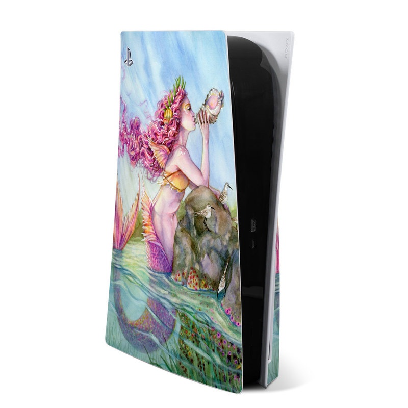 iStyles PlayStation 5 Skin design of Cg artwork, Mythology, Illustration, Fictional character, Watercolor paint, Art, Painting, Plant, Mythical creature, with blue, pink, purple, green, gray colors, and tagged with people, fantasy, animals, nature, objects, beach, fantasy, mermaid, mermaids, ocean, sci-fi, seashells.