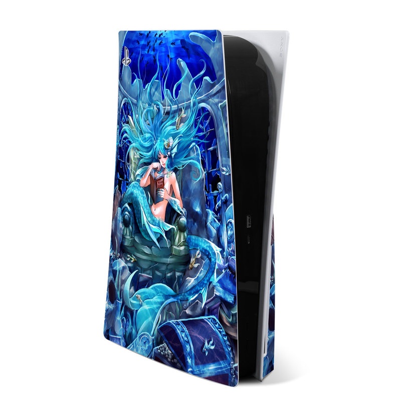 iStyles PlayStation 5 Skin design of Cg artwork, Fictional character, Electric blue, Illustration, Art, Mythology, Dragon, Games, Mythical creature, with blue, black, yellow, white colors, and tagged with people, objects, animals, fantasy, fantasy, fish, mermaid, ocean, sea, seashells, treasures.