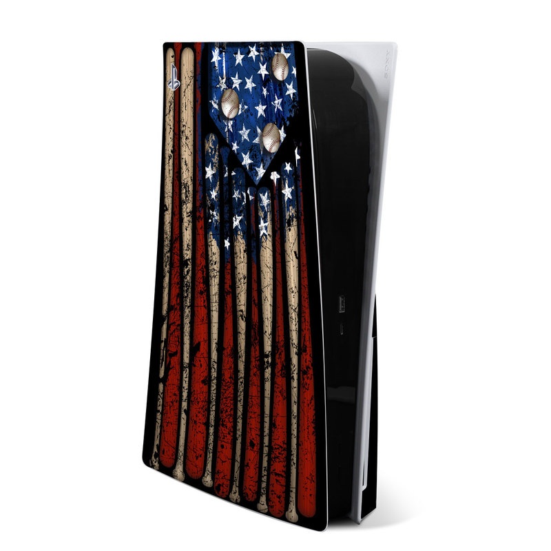 iStyles PlayStation 5 Skin design of Baseball bat, Baseball equipment, with black, red, gray, green, blue colors, and tagged with patterns, signs, flags.