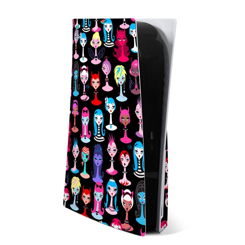 iStyles PlayStation 5 Skin design of Facial expression, Product, Font, Pink, Red, Magenta, Material property, Pattern, Fictional character, Illustration, with black, pink, blue, brown, red, green, white, yellow colors, and tagged with people, patterns, objects, flowers, dark, emo, girl, girls, goth, gothic, halloween, pinupgirl, punk, punkrock, rockandroll, spooky.