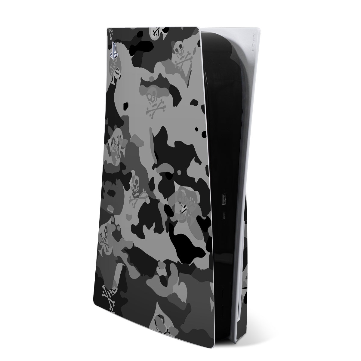 iStyles PlayStation 5 Skin design of Military camouflage, Pattern, Design, Camouflage, Illustration, Uniform, Black-and-white, Wallpaper, Art, with black, gray colors, and tagged with military, skulls, patterns, athlete, fitness, gym, skull, skulls, spade.