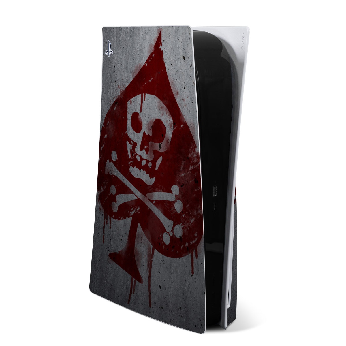 iStyles PlayStation 5 Skin design of Red, Street art, Art, Font, Wall, Graffiti, Visual arts, Illustration, Graphics, Logo, with gray, red colors, and tagged with military, skulls, signs, athlete, fitness, gym, skull, skulls, spade.