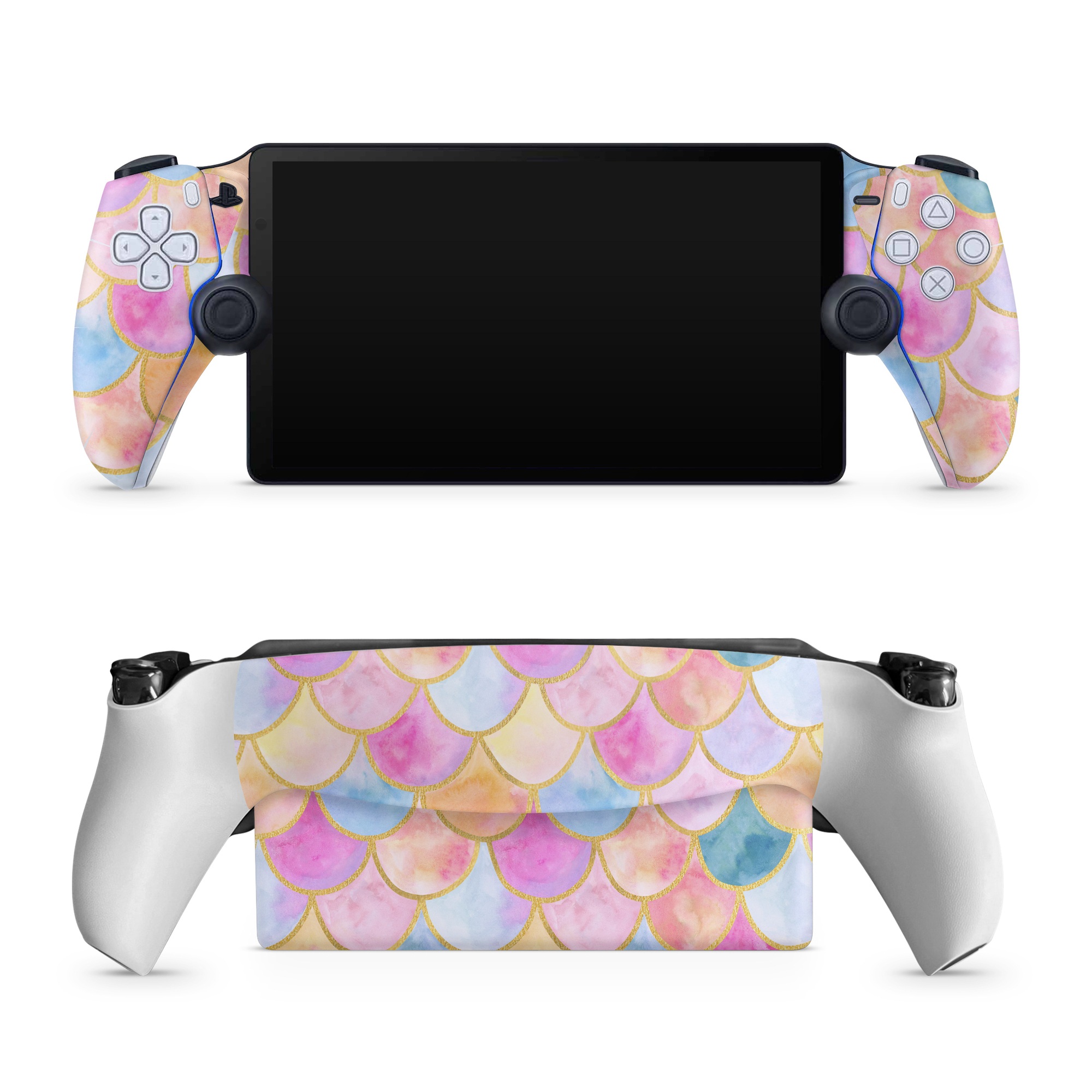 iStyles PlayStation Portal Skin design of Colorfulness, Natural material, Pink, Art, Line, Magenta, Red, Creative arts, Circle, Pattern, with pink, purple, blue, orange, yellow, white colors, and tagged with patterns, lookslike, mermaid, fish, colorful, fantasy.