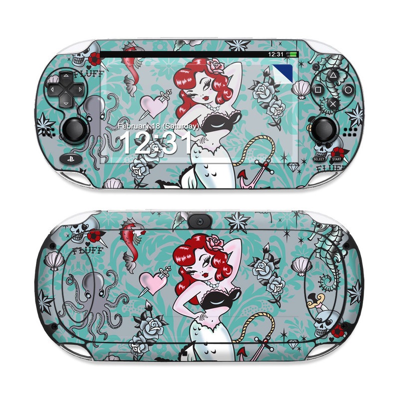 iStyles PlayStation Vita Skin design of Mermaid, Illustration, Fictional character, Organism, Art, Pattern, Style, with gray, blue, black, red, white, pink colors, and tagged with patterns, objects, hearts, people, animals.